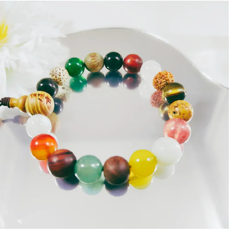 | Beads included | Verawood bead, rosewood bead, rudraksha bead, white jade bodhi, sandalwood bead, red sandalwood bead, pipal tree seed, silver obsidian, green agate, black agate, white agate, tigerโsย eye, yellow agate, strawberry quartz, green quartz, red agate, moonstone, star moon bodhi |